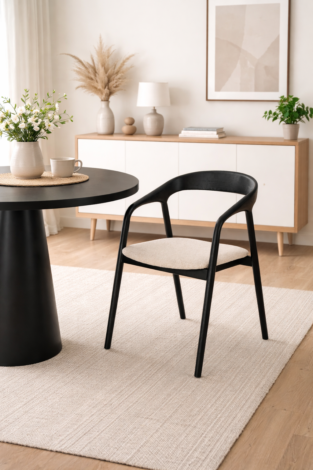 Woodek Esszimmerstuhl CELESTE aus massiver Eiche, schwarz lackiert, mit beigem Kunstleder
